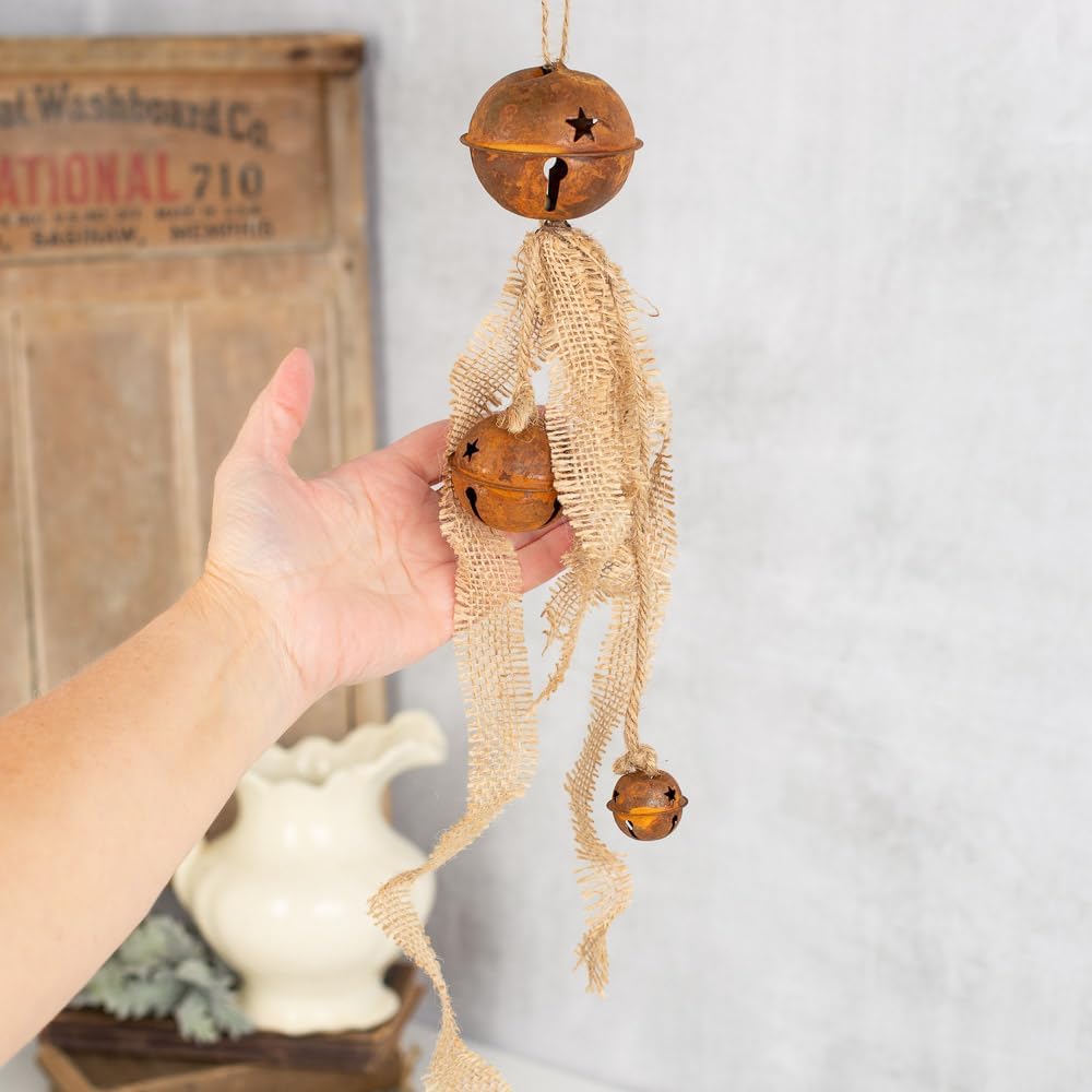 Rusty Tin Sleigh Bells and Burlap Ornaments. Size: 8-1/2" L