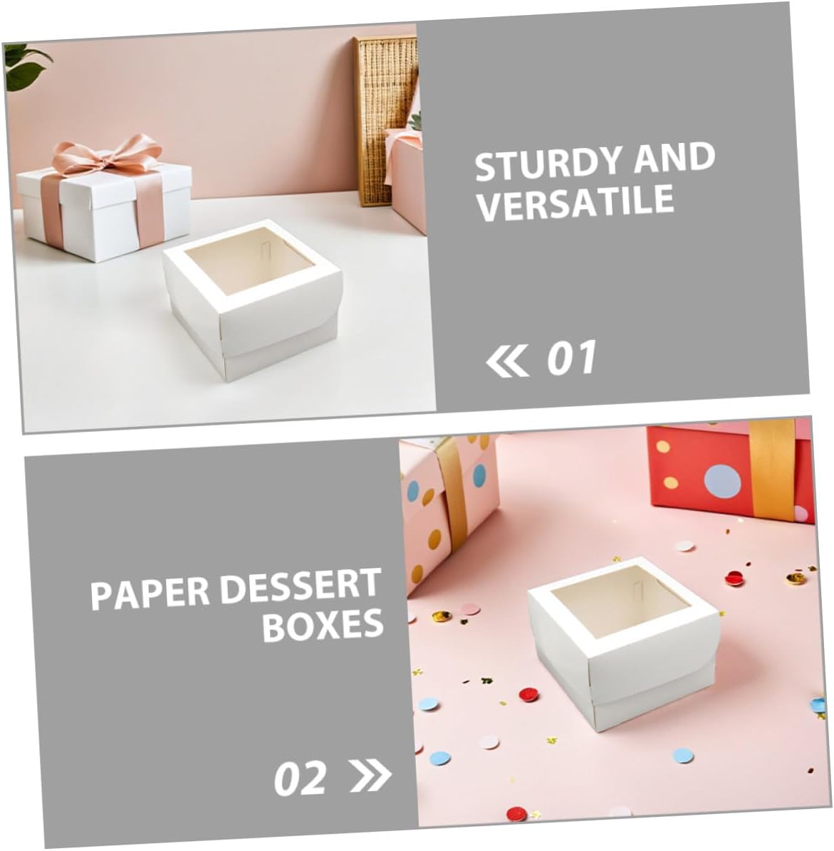 Package Include 25 x Cake Boxes Features -Product Info: Baking packaging boxes -Compact and portable cake holder: these small cake containers are designed for easy transport, making them ideal for carrying cakes, cupcakes, and other desserts food packaging boxes -Clear window for enhanced presentation: the transparent window design of these pastry boxes with window allows customers to view the contents, adding a professional touch to your bakery packaging cupcake carrier -Paper cake packaging boxes: made from recyclable materials, these paper bakery boxes offer a sustainable solution for packaging cakes and treats, reducing environmental impact -Material:Paperboard,PVC -Multifunctional pastry containers: for various desserts, these boxes with lids for food can be used for cupcakes, muffins, strawberries, and more, catering to diverse bakery needs sweet cake boxes -Color:White - and sturdy baking boxes: crafted from paper, these bakery boxes with window safe storage and transportation of cakes, pastries, and other baked goods small bakery boxes -Size:15.50X15.50X10.00cm/6.09X6.09X3.93inGoods Informationtreat boxes for cupcakes Designed for versatility, these paper bakery boxes with window are for storing and displaying desserts like mousse, pies, or cupcakes.pastry boxes These bakery cake boxes are ideal for takeout, present, or showcasing your baked creations.bakery treat boxes Their compact design makes them suitable as small cake containers or pastry packaging boxes