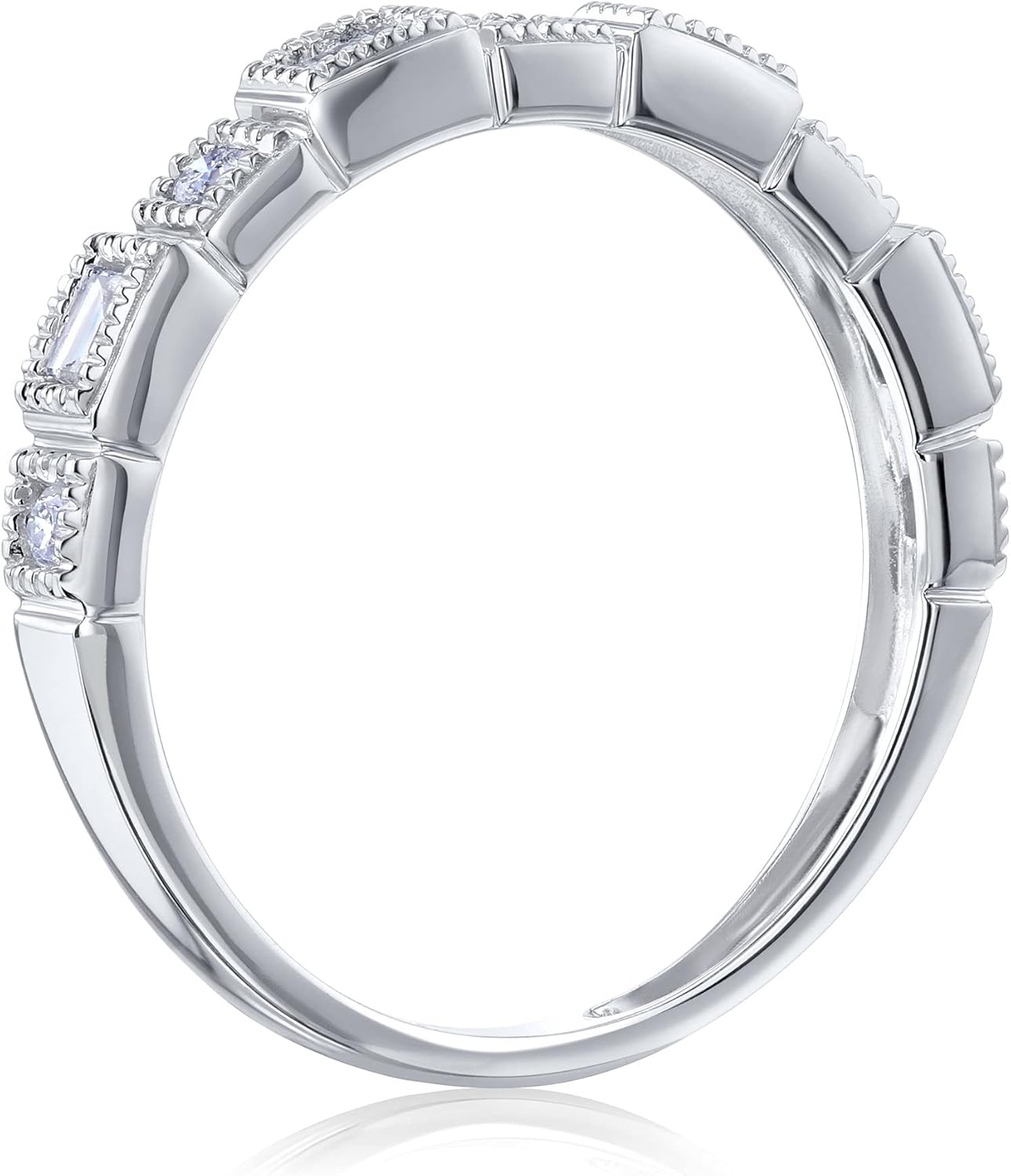 This vintage style diamond band features alternating baguette and round natural diamonds each framed in a milgrain pattern. The protruding baguette mounting gives more depth and a unique look to the style.