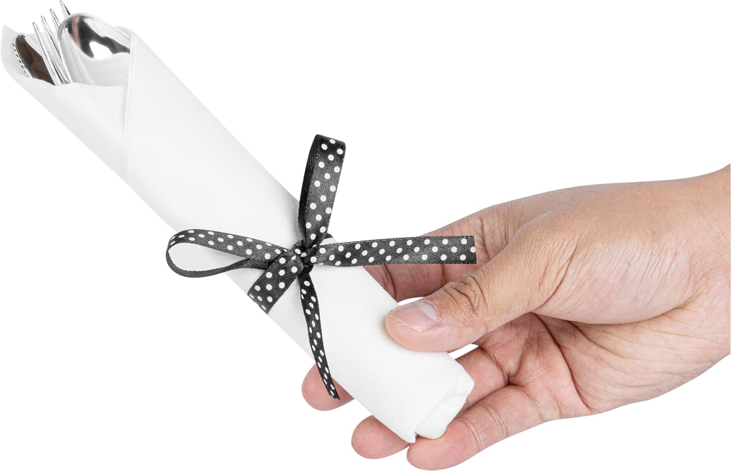 Get premium silverware without the hefty price with our Wrapped Argento Silver Cutlery Sets with Black Polka Dot Ribbons. Featuring a high-quality white napkin, these silver plastic cutlery sets are convenient options for guests to use at your cafe, restaurant, catering event, and more. With a spoon, fork, and knife in each set, this plastic silverware set is great for coordinating with delicious dishes from appetizers to desserts. Constructed from premium plastic, these durable silver plastic utensils are recyclable. Tied with a charming black polka dot ribbon, these disposable sets instantly enhance the decor of any venue. This silver plastic silverware measures 7.3 inches long by 2 inches wide and ships in a 100-count box.